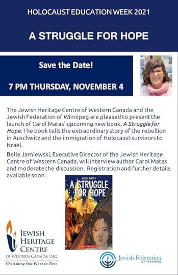 I am really honoured that my newest novel from Scholastic Canada will be launched as part of Holocaust Education Week, with the Jewish Heritage Centre of Western Canada and the Jewish Federation of Winnipeg.