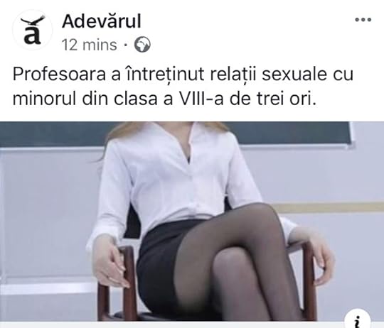 Acum fara gluma, imi amintesc cum eram eu pe la 14 ani, cu cosurile pe fata cat casa, benoclandu-ma toata ziua la calendarele Adesgo sau la femeile alea neepilate din Neckermann. De cate ori vedeam un gnunchi mai tanar de profesoara iesind de sub fusta, aveam impresia ca am ajuns in Rai si vad ingerasi. Unde n-as fi dat sa am si eu asa o profesoara, care la 34 de ani sa se uite la un puradel bubos! Doamna asta ar trebui premiata, ma! Femeile astea fac munca in folosul comunitatii, ajuta niste adolescenti in calduri sa isi capete respectul fata de sine si sa ajunga barbati. Unde mai pui ca ala mic avea vreo 15 ani, dar daca a mai ramas si putin repetent, batea spre 18.