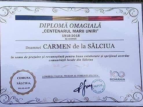 Se acorda DIPLOMA OMAGIALA „CENTENARUL MARII UNIRI” doamnei Carmen de la Salciua.