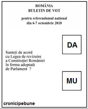 Asa ca m-am dus azi la partid si i-am spus lui Liviu Dragnea: Domnule Prim-Ministru, eu nu vreau sa votez ce imi spuneti voi, nu votez DA, nu vreau nici ca aialalti care i-am vazut ca este din opozitie, asa ca cer acum, in mod special sa se faca special pentru mine un buletin de vot cu optiunea MU. Ie un fel de a ma exprima, al meu, personal. Care exprima gandurile mele, care imi sunt scrise pe foaie de altii.