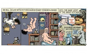 Over a decade ago, Maurice Sendak came to Harvard to see the Emily Dickinson Room at Houghton Library, Keats’s manuscripts, and to give a lecture to the students in my course on childhood. He referred to himself then as a “dinosaur” and worried about the decline in the quality of children’s books, though he conceded that he might also just be a “grumpy old man.” Over lunch, he was anything but, and, despite his stated aversion to signing books, he generously illustrated and signed title pages of all the books that the students had brought to class. I always referred to his visit as a golden afternoon.