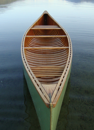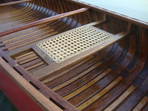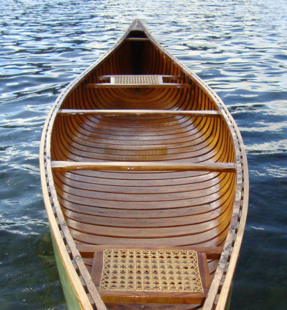 This is one of the first types of ‘carpentered’ canoe ever designed. They were one of the all-wood canoes constructed in the Peterborough region of Ontario starting in the 1860’s. The hull was constructed by first steam-bending ribs onto a solid wood mould and then attaching four wide basswood planks on each side of the canoe. Most of these canoes were painted although some were varnished.