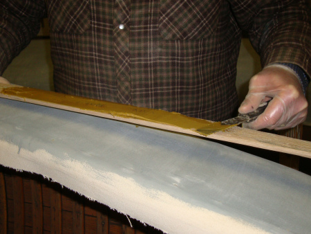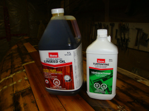 A mixture of boiled linseed oil and turpentine – usually in a ratio of two parts oil to one part turpentine has been the mainstay of wood preparation for exterior use for centuries. The mixture soaks into the wood and keeps it supple and strong for decades. It also prevents water from soaking into the wood thereby helping to prevent rot. I apply a coat of the oil/turpentine mix to the entire canoe and let the oil dry for a couple of weeks (again, if you leaving original varnish on the interior of the canoe, apply the oil/turpentine mixture to the hull exterior). The wood in old canoes is very dry and brittle, so lots of oil is required. I apply a single coat of oil and let it dry for at least a week.