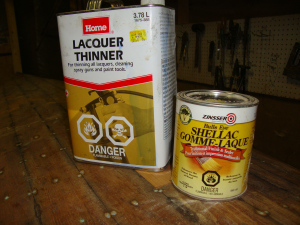 The concentration of shellac in the alcohol is referred to as the ‘cut’. I normally buy pre-mixed shellac at the hardware store which is typically a ‘four-pound cut’ – four pounds of shellac flakes dissolved in one gallon of alcohol. This is a rather thick mix. Most woodworkers prefer a two-pound cut. I dilute the pre-mixed shellac with lacquer thinner (a cocktail of volatile organic solvents usually including acetone, toluene, xylene and methyl ethyl keytone) in a 1:1 ratio. Normally, shellac dissolved in alcohol is anhydrous and turns cloudy white when it comes in contact with water – not a good thing for canoes. The addition of lacquer thinner prevents that from happening and gives me a nice two-pound cut to work with. In fact, shellac dissolved in lacquer thinner (primarily acetone) is often called lacquer. If you are mixing your own shellac from flakes, dissolve them in lacquer thinner alone in order to create a coating that will not become cloudy when it contacts water.
