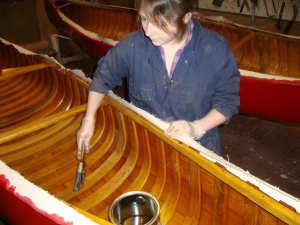 Set up your canoe in a well-lit space with good ventilation, away from direct sunlight. Pour about two inches (5 cm) of thinned varnish into a clean, empty one gallon (4 litre) paint can. Load the brush with varnish and rap the brush against the sides of the can to shake off excess varnish. Apply the varnish quickly and vigorously making sure that it gets into all of the corners. Work on a short section of the canoe. Then, look at the surface from an angle with work lights set up at an opposite angle to reveal any areas that were missed. Apply enough varnish to achieve full coverage while at the same spreading it thin enough to avoid drips or small pools. Don’t worry about streaks or bubbles. If the varnish is thinned properly, it will spread evenly and bubbles will disappear in a few minutes. Once you have full coverage, ‘tip’ the surface by touching it lightly and quickly with the brush bristle tips. It is best to tip the surface first across the grain of the wood and then with the grain. However, it is difficult to tip in both directions in the canoe interior, so I usually just tip in one direction following the grain of the ribs. The varnish is both applied and tipped very quickly. Then, move over to the next section of the canoe. Always maintain a ‘wet edge’ as you apply varnish to the full length of the canoe. Work in small sections to make sure that the varnish in that section is still wet when varnish is applied to the next section. That way, the entire surface will be smooth. Once done, go away and leave the canoe in a well-ventilated, dust-free space for 48 hours. I normally apply two coats of shellac and three coats of varnish.