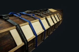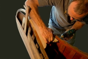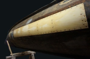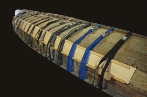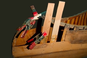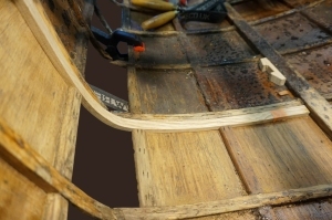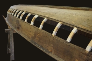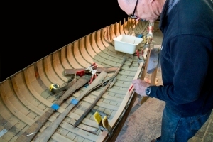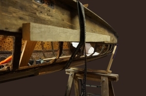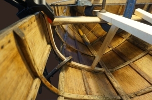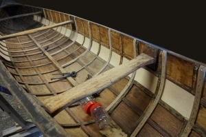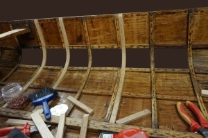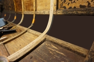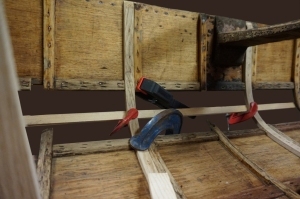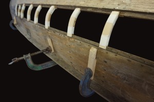 In some sections, retention of the original hull shape was facilitated by clamping a hardwood batten on the outside of the exposed original ribs.