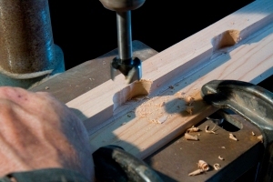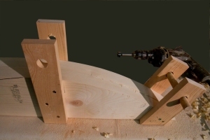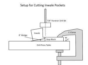 Set up a drill press as illustrated and prepare in-feed and out-feed supports for the inwale.