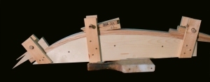 The set-up is comprised of the new deck steam-bent between two solid-wood bending forms. They are both fashioned from a number (in this case, four) of 2×8 pieces of spruce lumber sandwiched together into a 6×8 block (held together with 2½” deck screws). The bottom block has the concave shape of the deck-bend cut into its top surface while the top block has the convex shape cut its bottom.
