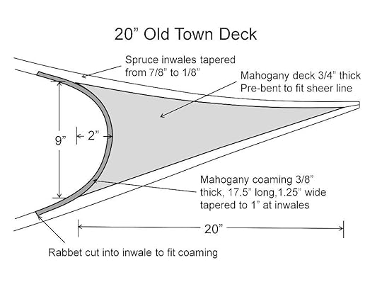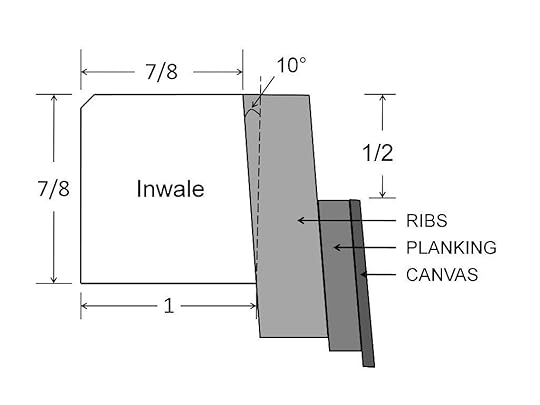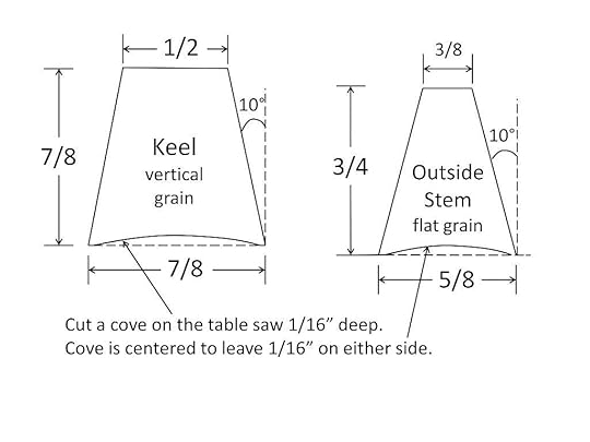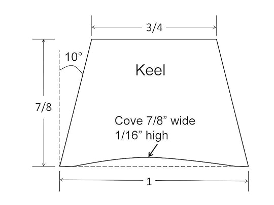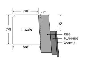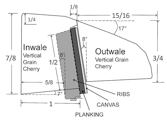 – The keel is made of vertical-grain white oak, and has a 1/16″ cove at the base. If the canoe is fitted with outside stems, the keel tapers gradually to join with them at each end. Otherwise, the ends taper to 3/8″ wide while the height feathers gradually to nothing.