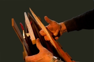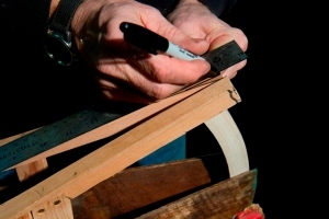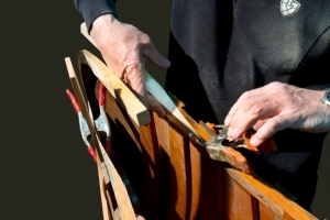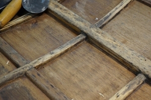 The broken sections of original rib were cut away with the inlay saw as well as the sections of batten required to allow for positioning of the new rib which was then soaked, steamed and clamped in place.