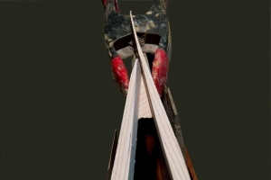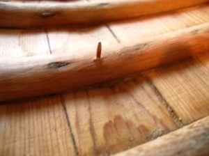 The nails were then ‘dubbed’ (bent over) to lie flat along the ribs (with the points towards the keelson) and then clinched tight with a clinching iron and cobblers hammer. The seams between the basswood boards were covered with ironwood battens between the ribs held in place with copper canoe nails.