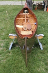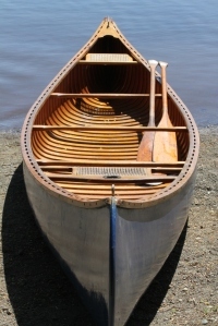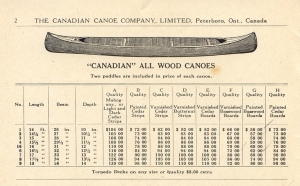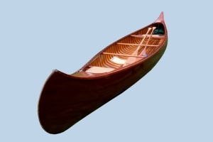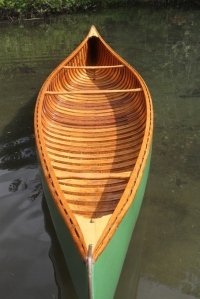 My canoe was made by the Canadian Canoe Company in Peterborough, Ontario. The company started in 1892. The last canoes of this type were built around the mid 1930’s. From the 1929 catalogue, my canoe is the 15′ 6″ No. 4 all wood canoe F quality (varnished, basswood boards). It has a 29½” (75 cm) beam and a depth of 11½” (29 cm) amidships. It is interesting to note that the garboards (the two planks on the bottom of the canoe) in my canoe are Spanish cedar ̶ a true mahogany.