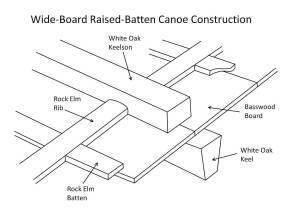 The exact origin of wide-board raised-batten canoe construction on a solid wood form is up for debate, but it was probably developed in a combined effort by Tom Gordon and John Stephenson in 1857. Construction began by laying down a white oak keelson. Rock elm ribs were then bent over the form and fitted into notches cut into the keelson. Wide basswood boards (three or four on each side) ran longitudinally and were attached to the ribs with copper canoe nails. Nail holes were pre-drilled and the nails were driven straight into the solid-wood form. The hull was then pulled free of the form and turned right-side up.