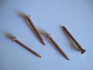 Copper canoe nails (14-gauge 1″ or 25 mm long) are harder to get out than tacks on a cedar-canvas canoe as they are driven through a basswood (or Spanish cedar) plank as well as rock elm ribs before being bent over (dubbed) and clinched. The nails aren’t tapered either (apart from the point) and they hold well despite their age.