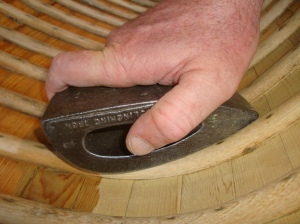 Next, whilst pushing them firmly from the outside, I bend (dub) the nails over with a clinching iron.