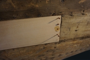The new plank is a piece of basswood cut carefully to its final dimensions and planed to match the thickness of the original boards (¼” or 6 mm). The end of the new plank butts up again the existing board and laps over it with a chamfered edge to match the chamfer on the existing board.