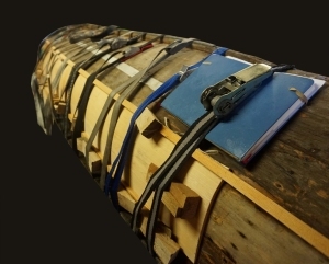 Because the canoe has had broken ribs for many years, it needs a bit of reshaping before I can bend and install the new rib material. Straps around the canoe with a couple of lengths of timber to push in the right places helps to reshape.