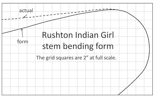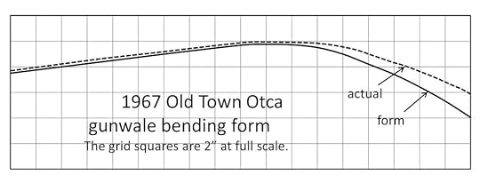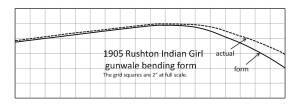 The original curve was increased to compensate for spring back. Here is the diagram of the bending form used for the OTCA gunwale ends.