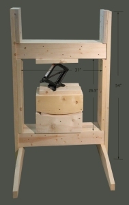 Pressure for bending the deck is generated with an automotive scissor-jack forcing the bending forms together in the middle of a press frame constructed from 2×6 lumber. In this case, the inside dimensions of the press are 26½” (67.3 cm) high by 31″ (79.7 cm) wide.