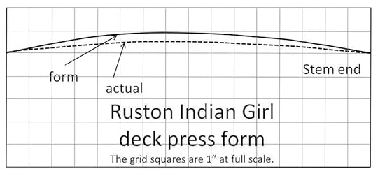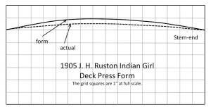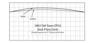 The curve required to achieve the correct bent in the replica deck is greater than the actual curve. This is due to the fact that a solid piece of wood will spring-back a little once the tension is removed in the press. To save you the trial-and-error process involved in getting the proper curve, I present a diagram that will allow you to get it right the first time.