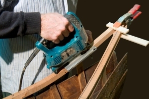Hold the new inwale directly under the original inwale and shift it around until you match the bend. Use a permanent ink pen to mark the location of the scarf joint on the new inwale. Check to make sure the new inwale end meets the new stem-top in the same place as the original. Use a band saw to cut the scarf angle (other saws can do this job, but the band saw is the safest option and gives the best control).