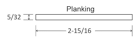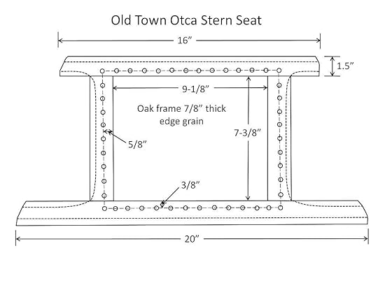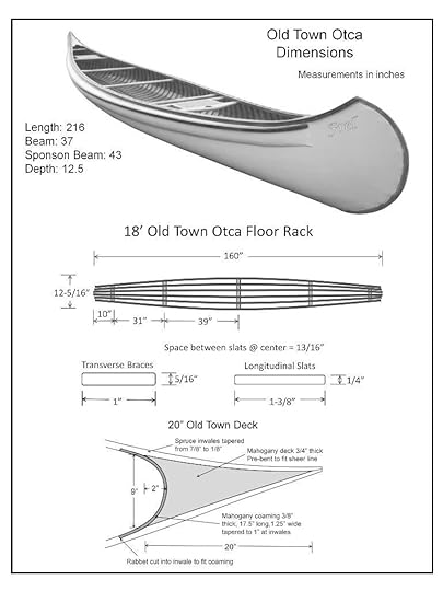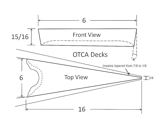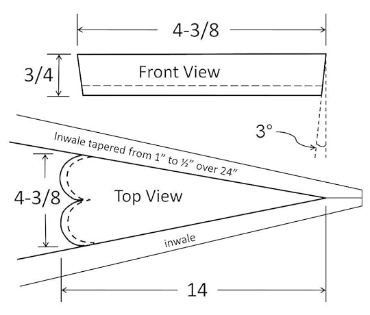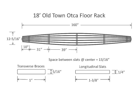 Floor Rack – According to a reference for a 15’ Indian Girl, the longitudinal slats in the floor rack are 7/8” wide, spaced 1” apart at the center, for a width of 10.25” at the center. I did not have a floor rack for reference when I built one, so I took a guess. In my floor rack for a 16’ Indian Girl, the longitudinal slats are 1” wide, spaced 1.25” apart at the center, for a width of 12.25” at the center.