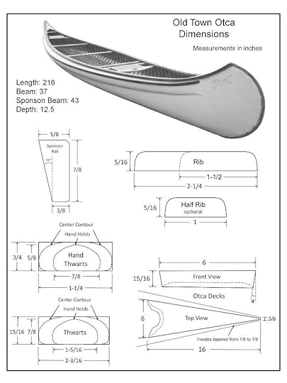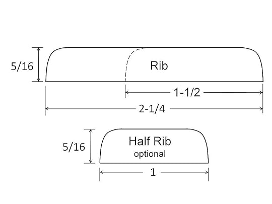 Ribs – The ribs are 5/16” thick, and 2.25” wide. The top edges are rounded off. The rib tops are tapered gradually to 1.25” wide on the side closest to the center of the canoe. Some Old Town canoes are fitted with half ribs between the regular ribs. They are 5/16″ thick and 1″ wide.