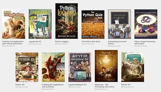 Python 101Python 201: Intermediate PythonReportLab: PDF Processing in PythonJupyter Notebook 101Creating GUI Applications with wxPythonPillow: Image Processing with PythonAutomating Excel with PythonThe Python Quiz BookPython LoggingJupyterLab 101I hope you’ll check out the sale, but even if you don’t, I hope you have a great holiday weekend!
