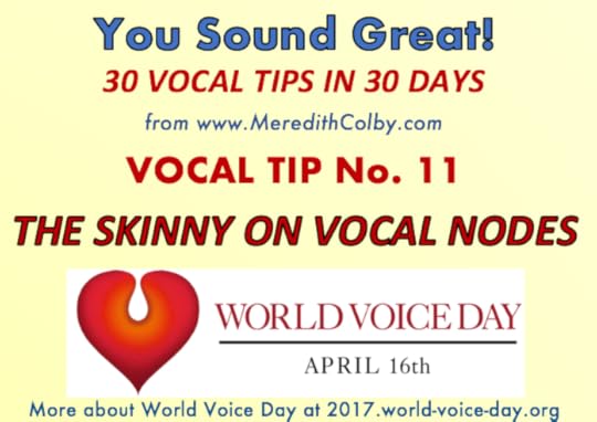 30 Vocal Tips in 30 DaysNo. 11 THE SKINNY ON VOCAL NODESVocal nodules are, basically, little bumps on your vocal folds. There are several conditions that can result in vocal chord bumps. (British Voice Assc.has a good article about nodes.)Nodes are typically caused from speech habits, overuse, or trauma.Your voice teacher did not give you nodes.Different people have different voices; more or less vulnerable to damage and fatigue.Being diagnosed with vocal nodes only means that you need to find out why you have them, and address the issue.Nodes are not a statement about your singing.Nodes are small bumps that keep the vocal folds from coming completely together. Continuing to sing and speak with nodes will create other compensatory behaviors in the larynx, as well as allowing “soft” nodes to become “hard.”If you change your speech habits and rest your voice, most vocal nodular-type conditions can heal and go away.Speech therapists help people with this. So do voice teachers.If a laryngologist determines that you need surgery to remove your nodes, don’t fret. Laser surgery for voices is precise, heals quickly, and is very low risk.TAKEAWAY:If you have nodes, or think you have vocal nodes, don’t judge. Get a diagnosis, learn, and heal.
