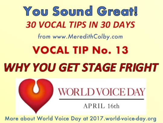 30 Vocal Tips in 30 Days[image error]No. 12 4 HACKS FOR STAGE FRIGHTStage fright is a particularly frustrating problem because it feels beyond your control. You think you’re doing well, or you imagine you can talk yourself out of it, and then – 30 minutes before you go on, or 30 seconds after you’ve begun – you’re victimized by a cascade of symptoms. There’s no sure-fire way to get control of your response to stage fright, but here are some things that could help.Diaphragm breathing: When you’re afraid or stressed, you take short, shallow, and irregular breaths. When you sleep, you take long, deep, and regular breaths. If you can make yourself take “sleeping breaths” it will be harder for your body to remember that it’s panicking.Choose your thoughts: People with stage fright tend to imagine the worst, and those thoughts increase the symptoms. Instead, think (or even say out loud) thoughts that will calm and reassure you.Visualize: This won’t help in the moment, but is your best investment in the long term.Beta Blockers: Better living through chemistry, people. Beta blockers are a non-addicting, cheap drug that blocks the effects of adrenaline. They really work for musicians with stage fright. You’ll need an Rx.TAKEAWAY:Stage fright is treatable.