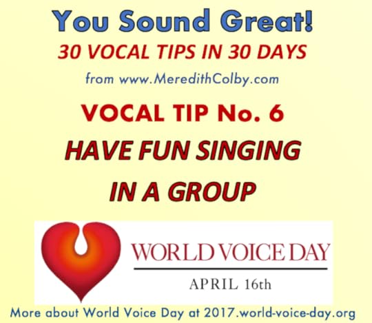 30 Vocal Tips in 30 DaysNo. 6 HAVE FUN SINGING IN A GROUPChoirs are for other people. Until you join one. Then you realize how transformative it is to sing in a group; to have your voice be melded into the greater whole of music and complex sound waves. Singing in a group gets you out of the house, moving your body, interacting