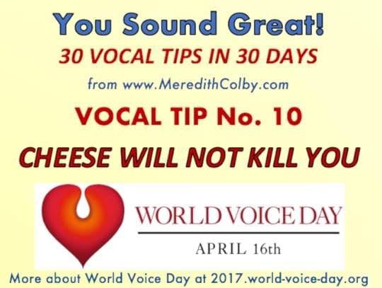 No. 10 CHEESE WILL NOT KILL YOUA non-singer reading the title of Tip #10 would wonder. A singer would totally get it.Singer are frequently given food & drink rules by voice teachers and fellow singers. For instance:Do not eat dairy; it makes you phlegmyDrink tea with honey; it helps your voiceAvoid caffeine in general, coffee in particularSuck lemons; it breaks up the phlegmDon’t eat two (or three or four) hours before you singThere’s nothing wrong with any of these dietary guidelines. Anything that has helped another singer, especially if that singer has the same issue you do, is worth trying. But don’t get attached to any one proclamation as an absolute truth. Everyone is different, and everyone will respond differently to various things at different times in their lives. What works for someone else might be horrible for you, and vice versa.TAKEAWAY:You’re the only one who can determine whether what (and when) you eat is helping or impeding your singing.
