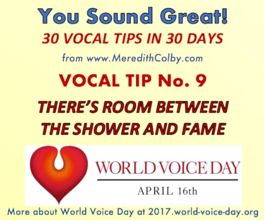 No. 9 THERE’S ROOM BETWEEN THE SHOWER AND FAMEEvery time someone tells me they “can’t sing” I cringe a little. Singing is one of the great joys of being human, but many people seem to believe that they have to be great at singing to participate in singing.The fact is that there are a lot of reasons to sing, a lot of places to sing, and a lot of people who would like you to sing for them, or with them. The internet has made is very easy to find community choirs, community theater, karaoke nights, and open mics. You don’t have to be ready for The Voice; if you love to sing you can lead a sing-along at an assisted living facility, sing lullabies at a children’s hospital, start a casual singing group, or join the choir at your church/temple. You may not think you have fun friends, but YouTube karaoke and bottle of wine can turn anyone into a fun friend!Nota bene:Maya Rogersis a wonderful writer and advocate for the positive effects of singing.TAKEAWAY:You don’t have to be perfect. Begin.