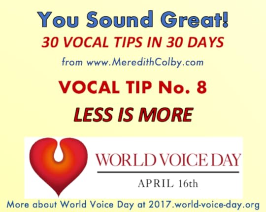 No. 8 LESS IS MORESinging is a natural thing that everyone can do. If you’re pursuing being a better singer, then singing probably comes easily to you. That can be a problem.Your voice is a gift, and singing is a skill. To get better at something, you have to practice with intention. You have to push yourself out of your comfort zone; something few people are inclined to do. You also have to make time to practice, which is the part that trips singers up more than anything else.Most people can, and will, make time for something if the time being made is short; say, 5 or 10 minutes. You may not be practicing because you think you need to have an hour, or a half an hour, to practice. The days go by and none of those days hand you that hour you need, so you show up at your voice lesson (or whatever) without having practiced. Again.If you’d set aside that 10 minutes a day, you would have practiced for more than an hour that week. You would have moved toward your goals.TAKEAWAY:Something is more than nothing.
