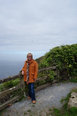 The area plays a role in my Sharpe & Donovan series. In Harbor Island, octogenarian art detective Wendell Sharpe and FBI agent Matt Yankowski meet on the first leg of the cliff walk, near a church ruin not far from where I’m standing in this photo (in my ubiquitous orange Irish raincoat!).