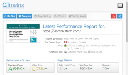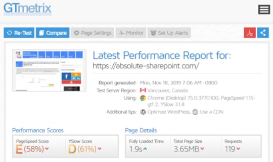 Now a note about the design! The top header is still inspired by SharePoint, but by the new SharePoint logo, so I hope they will not change colors anytime soon . The headers have a OneDrive blue color, and the link hovers are Pluralsight orange/red/pink (can you tell I am not a designer )? Other than the design being more modern, I have also cut down the number of WordPress plugins, made the site more responsive, as well as improved the site speed by a lot as you can see in the screenshots below! Test in this case is the home page, however similar results are there on individual pages as well.