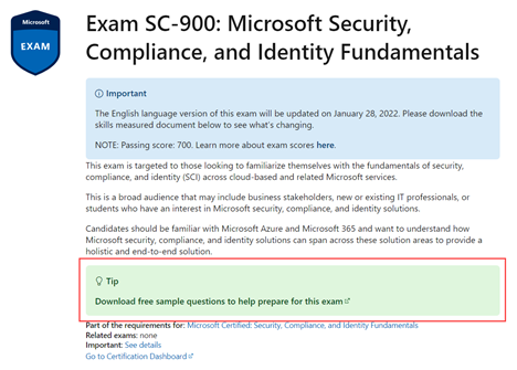 As I was browsing a certification on the Microsoft Learn site – I realized something new showed up on the page – a Tip to Download Free sample questions to help prepare for this exam! I haven’t seen this announced anywhere yet – so I wanted to write a quick blog to share what I found so far!