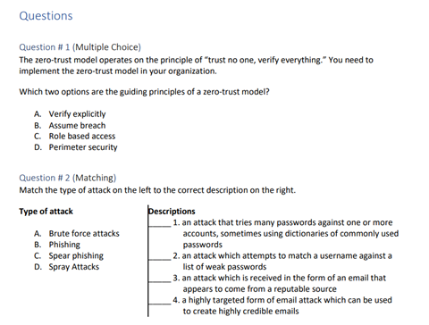 Testing ChatGPT against the SC-900 Practice ExamThe SC 900 practice exam covers a range of topics, including Microsoft’s security solutions, compliance regulations, and identity management. We used the first 10 questions from the practice exam to determine ChatGPT’s potential of passing the practice test.