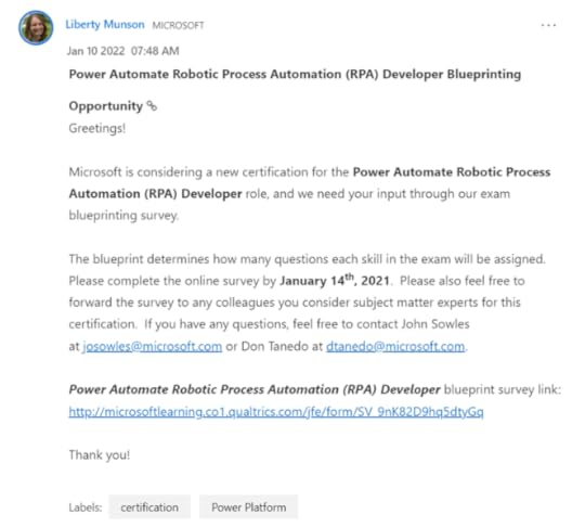 With Microsoft’s product solidified, next thing Microsoft will need is a pool of talented professionals able to actually create RPA solutions with Power Automate, and hopefully for Microsoft migrate them from competitors, in the Power Platform ecosystem. In January 2022, we had a post on Tech Community that Microsoft is considering a new certification for the Power Automate Robotic Process Automation (RPA) Developer.