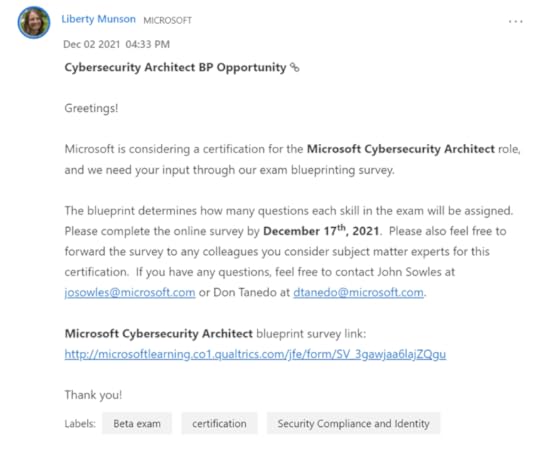 In December 2021, we had another post on the Tech Community sharing that Microsoft is considering a certification for the Microsoft Cybersecurity Architect role. Given Architect in the name, we can be pretty confident that this will be an expert level certification and will fill that gap inside the SCI Portfolio.