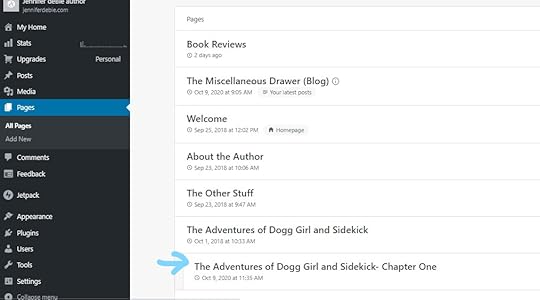 Meanwhile, at the back of the house, instead of a second, self-organized and neatly separated Posts Page, each new review is going to be it’s own subsidiary page, and my lovely, organized “page manager” bar will expand exponentially. This is what it looks like right now, but every other week a new subsidiary page will be added below Book Reviews (à la the Chapter One sub page below The Adventures of Dogg Girl and Sidekick). One or two of these subsidiary pages won’t make much difference, but when there are five posted? Ten? More?