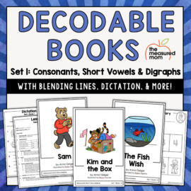 This is our first set of decodable books, featuring CVC words and simple digraphs. Students love the characters and stories!