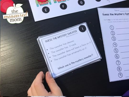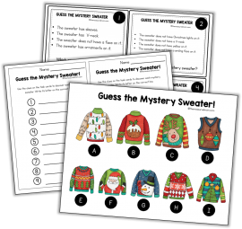 I created a set of task cards. Each card has a set of clues to help kids determine the mystery sweater.