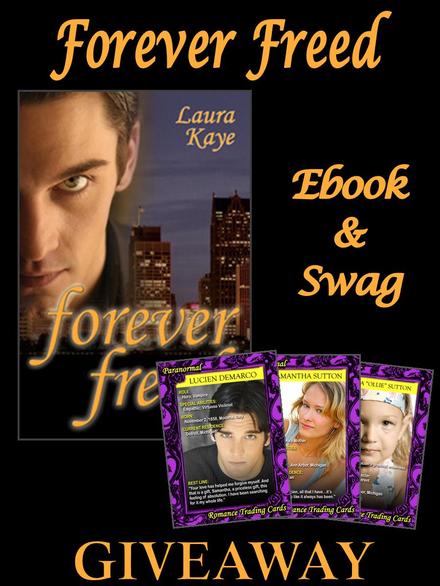 We are giving away one ebook copy of Forever Freed by Laura Kaye to one lucky winner and two sets of Forever Freed romance trading cards to two runners up!