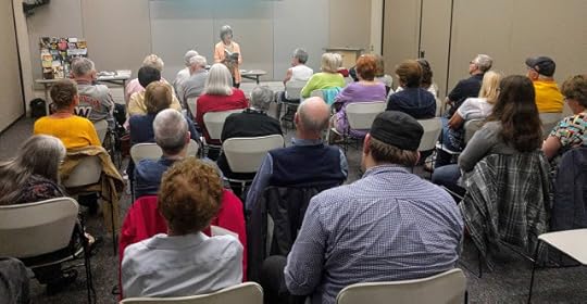 My best attended library event was a Read Local at the Bettendorf Public Library. I still felt new to the Quad Cities and hadn’t expected much of a turnout. I made up flyers that had the book cover and excepts from reviews along with location, date, and logos of the sponsors (MWC & BPL). At that time, I attended three book clubs in Davenport and a grief support group in Moline. They all got flyers. I handed out flyers to my main critique group, Writer’s Studio. I did an old-fashioned mailing to people living in my neighborhood using stamps commemorating the upcoming solar eclipse. I was included in the BPL’s color brochure for Read Local and in other library announcements. On my night I got a few people from each group I’d reached out to. So, instead of getting the usual dozen or so for an average reading we had to keep adding chairs. We ran out of books to sell. It was great!