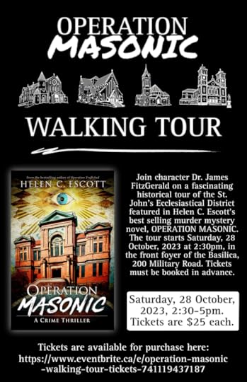 Join author Helen C. Escott and John FitzGerald, Executive Director of the Basilica Heritage Foundation, as they take you on this fascinating tour, which is based on the investigation by the book's lead character, Royal Newfoundland Constabulary Inspector Nick Myra. The tour follows his trail as he investigates a murder at the Masonic Temple. Unravel the mystery and visit the sites mentioned in the book while looking for hidden Masonic symbols in downtown St. John’s.