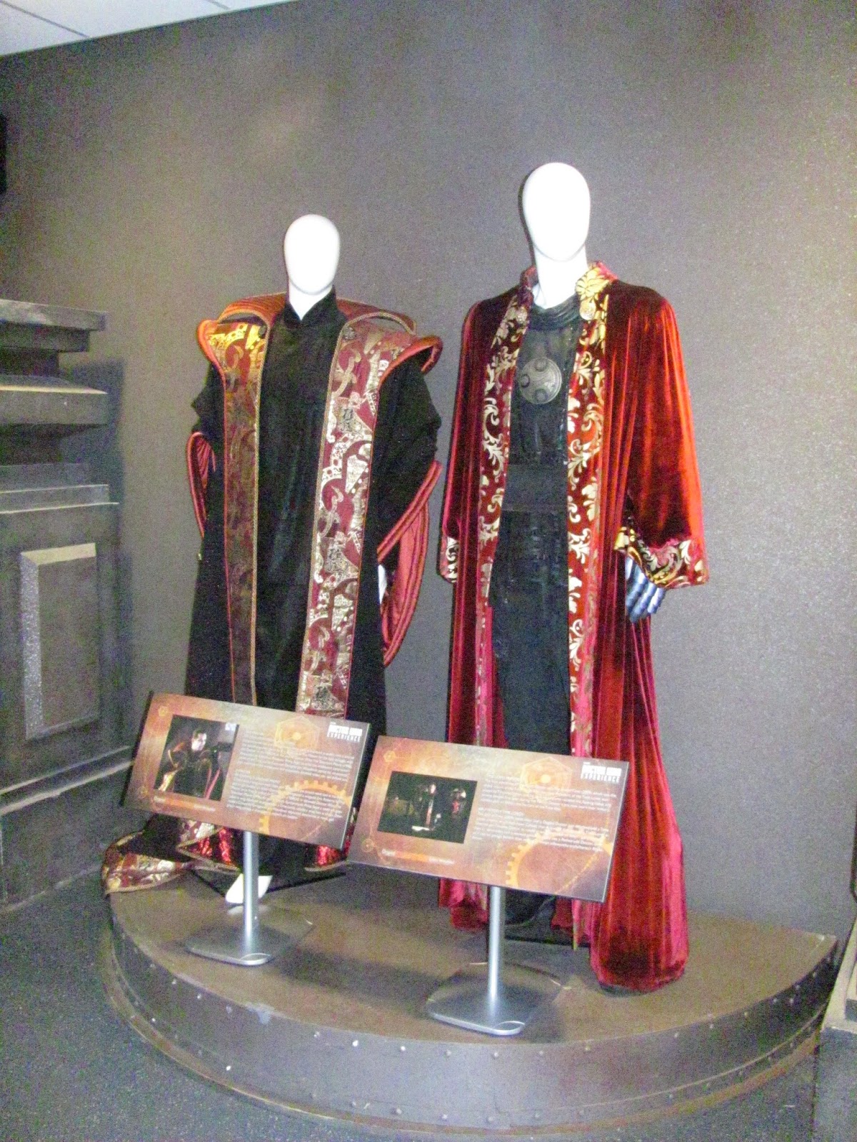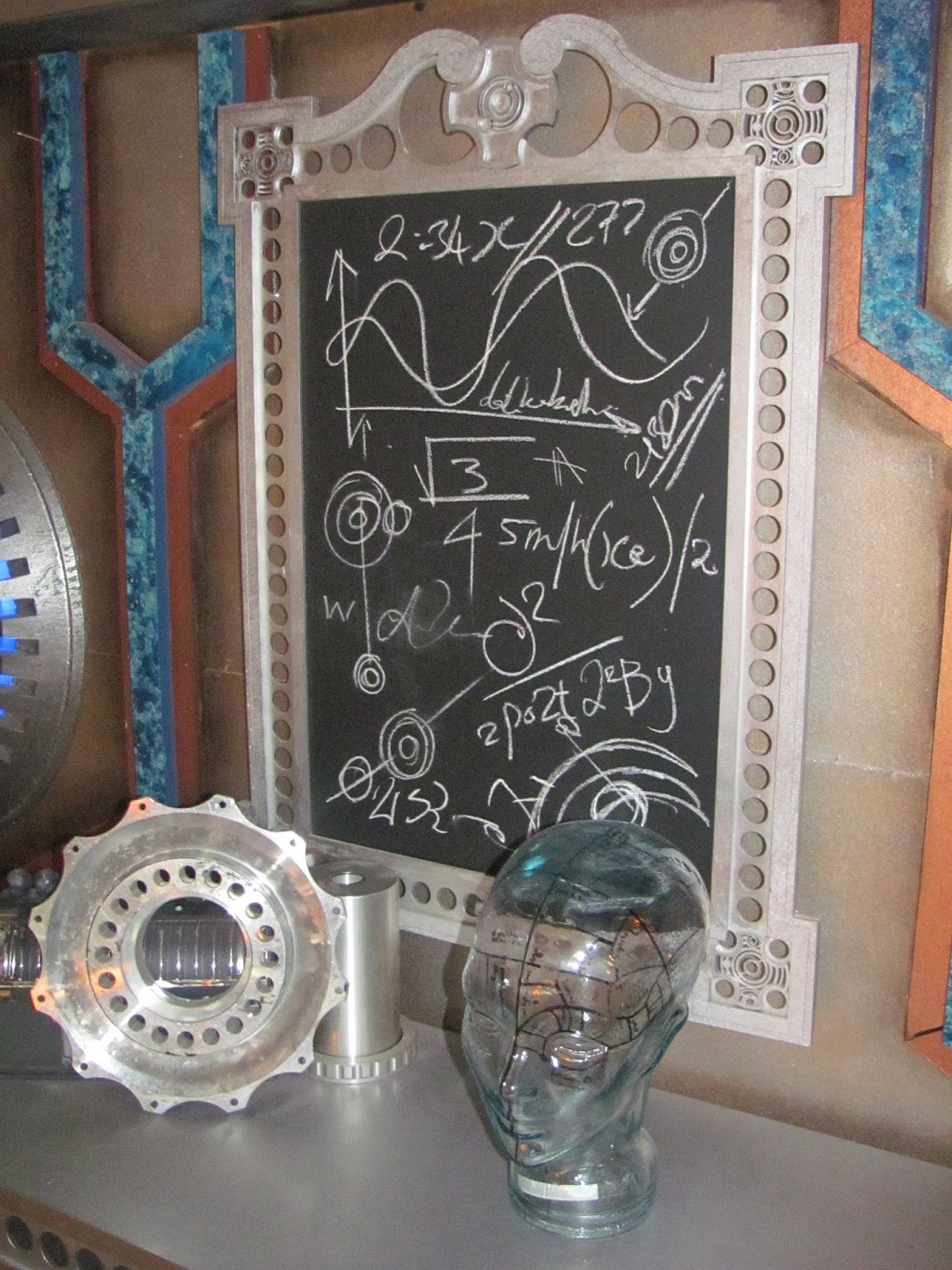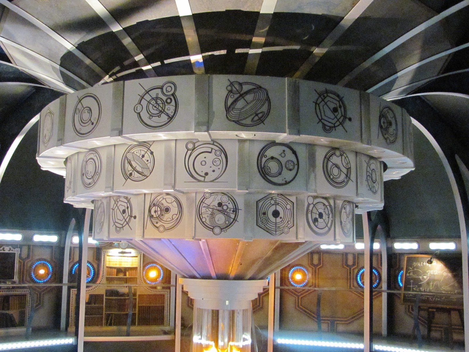 On the upper level there are bookcases full of books, tables piled with magazines and other things, blackboards covered with arcane scribblings ... skulls, ornaments ... all manner of exotic ephemera. It's lovely! You can walk around the whole room, with staircases down to the main console area, and there are also blocked off exits to the rest of the TARDIS as well ... We were told that sections of the upper area can be removed to allow cameras in, but it works brilliantly as an enclosed space as well.