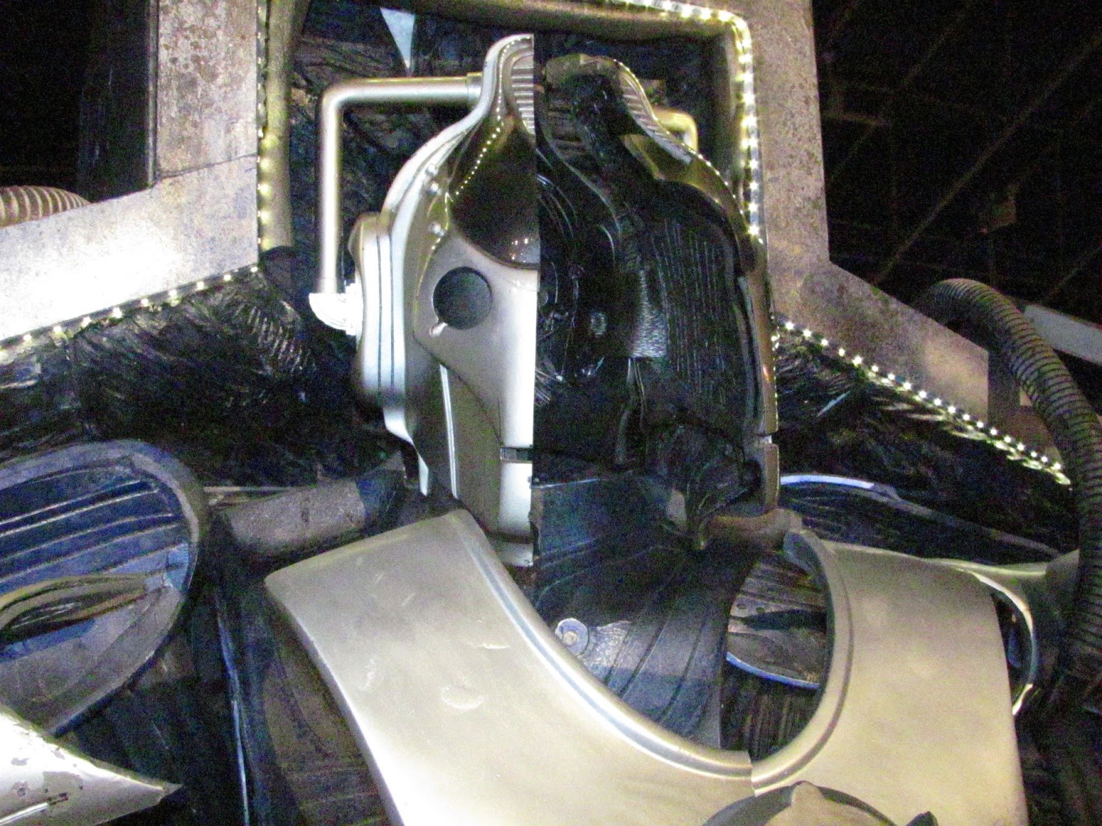 Under the main area there's the lower floor, which again has tables covered with bits of junk and equipment, there's a hatstand, chairs ... and the under-console area, which again is fully practical in that each section lifts up allowing access to the tubes and pipes and whatever else they want to put down there. I was so impressed at the thought which has gone into making the whole set as practical and tactile as possible, so that pretty much any future requirement can be incorporated depending on what the scripts demand. Very clever. This also helps to ground the TARDIS as a real object, a solid and practical space where the Doctor and companions can live and travel and which feels like home.
