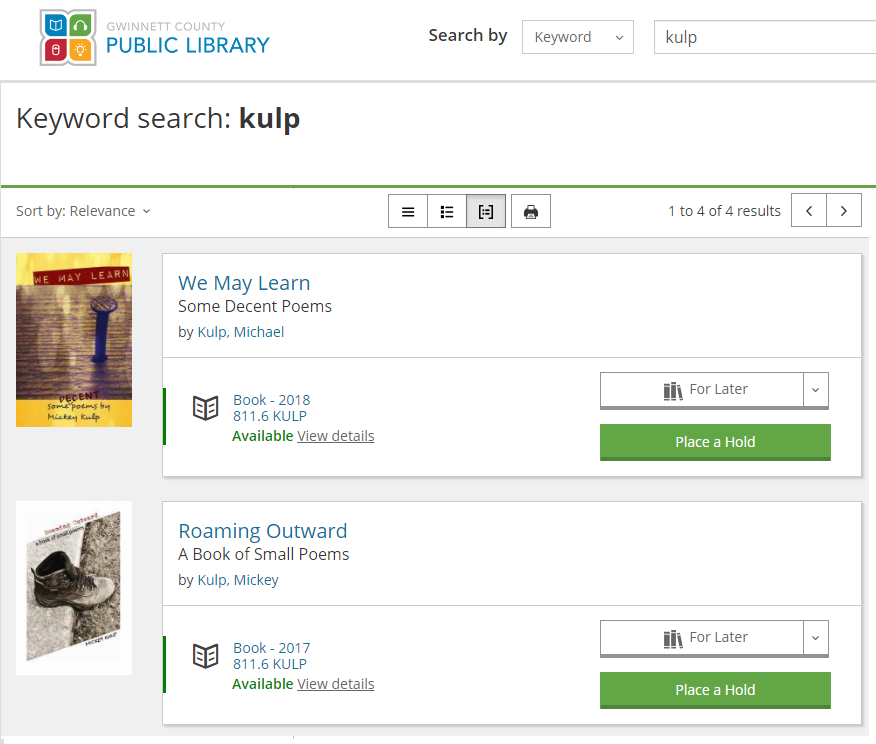 Jenny, the Technical Services Manager at Gwinnett County Public Library, sent me some good news today. They have added my latest book of poems, We May Learn, to the GCPL collection.