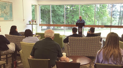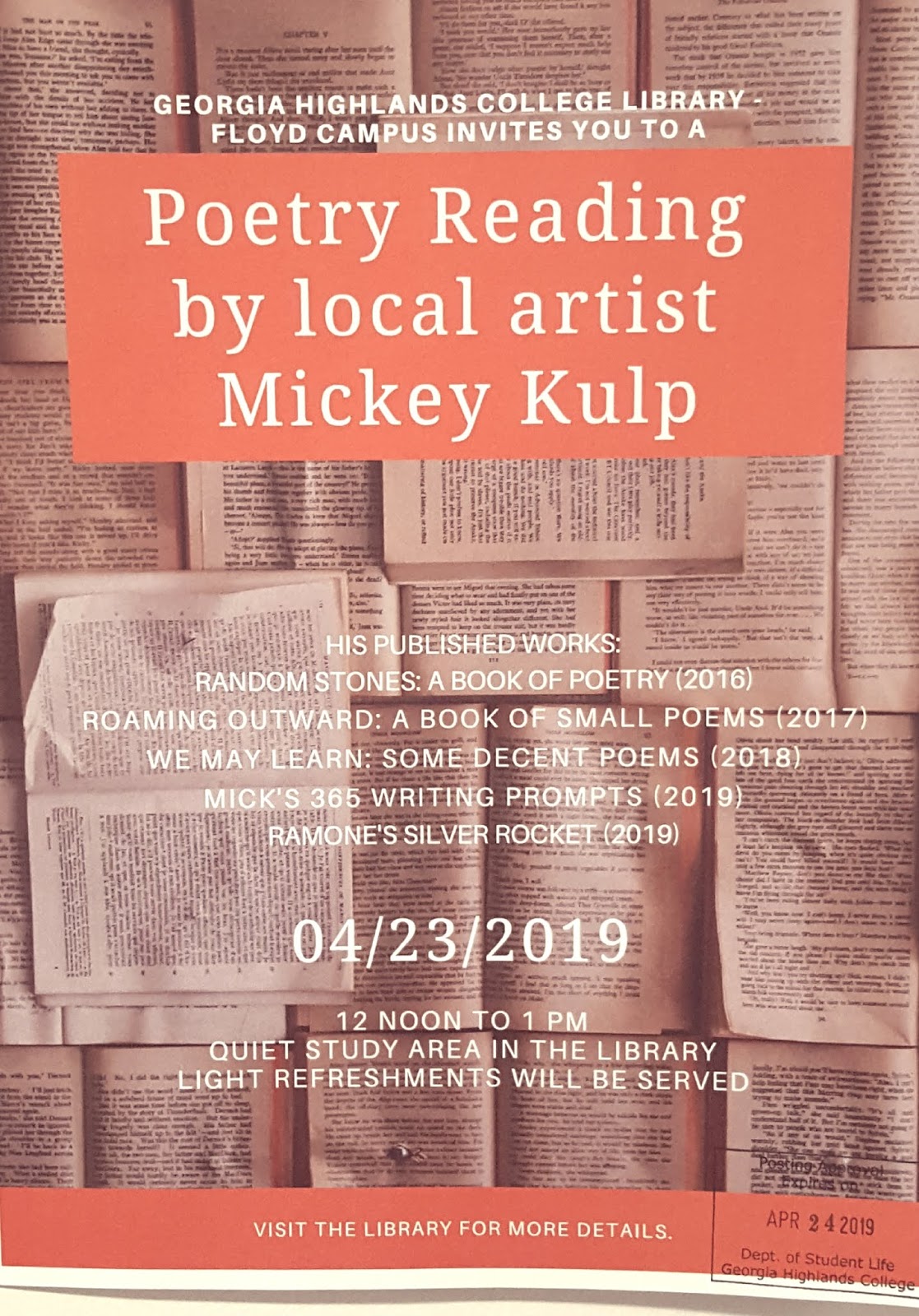 To celebrate National Poetry Month, I was invited to Georgia Highlands College on April 23. The library staff at this lovely campus had prepared a corner overlooking a nice pond and, better yet, loaded a table full of pizza for the attendees.